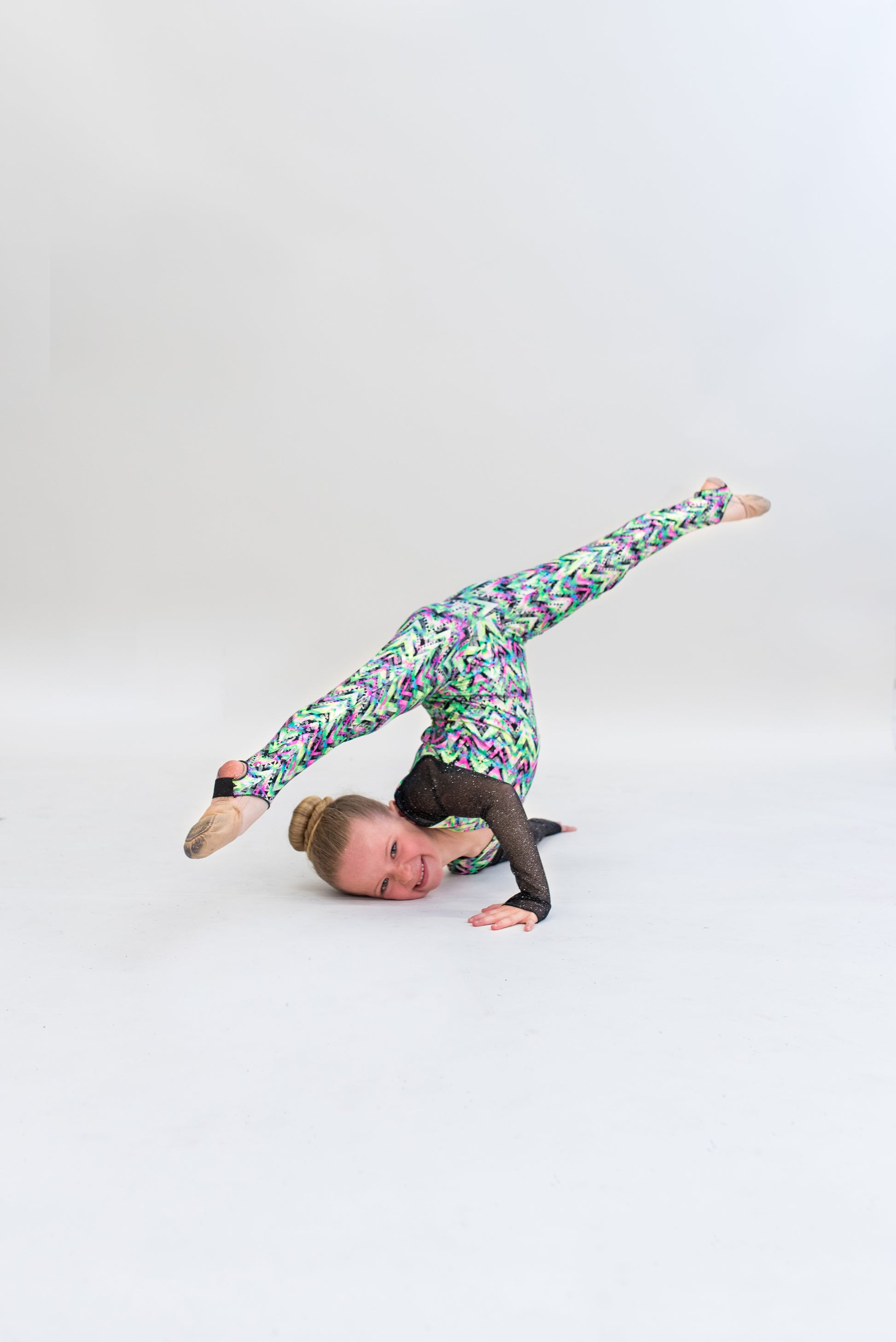 Dazzling angular multi-coloured print with arm cutouts in black glitter mesh, open keyhole back and front pinch detail..