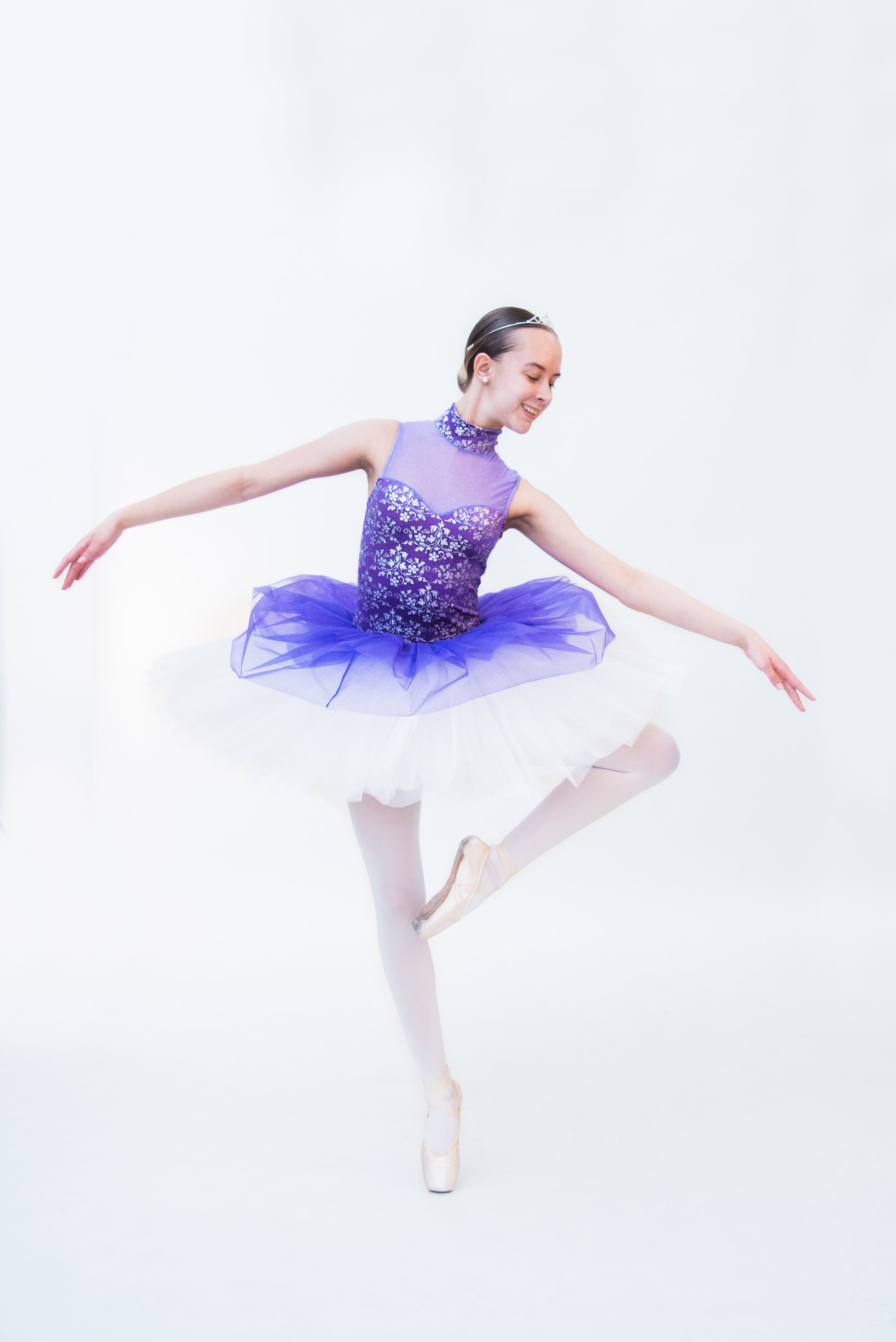 For the aspiring prima ballerina, the ultimate classical ballet presentation. Glitter embroidered purple deluxe velvet in high neck style with chest cutout in purple glitter mesh, attached tutu in purple glitter tulle and detached tutu in crystal white. Both pieces included.