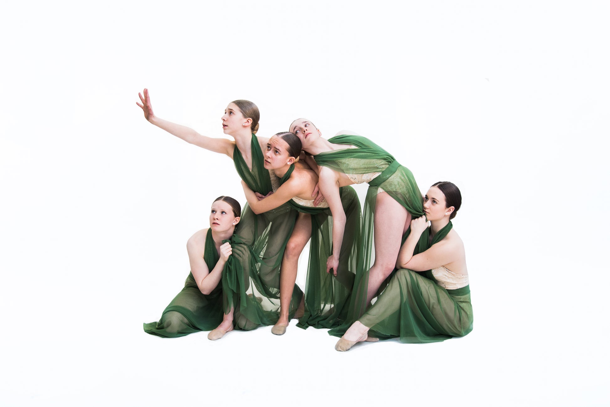 Gorgeous nude and gold sequin halter style bodysuit with overlay dress in earth green soft mesh..