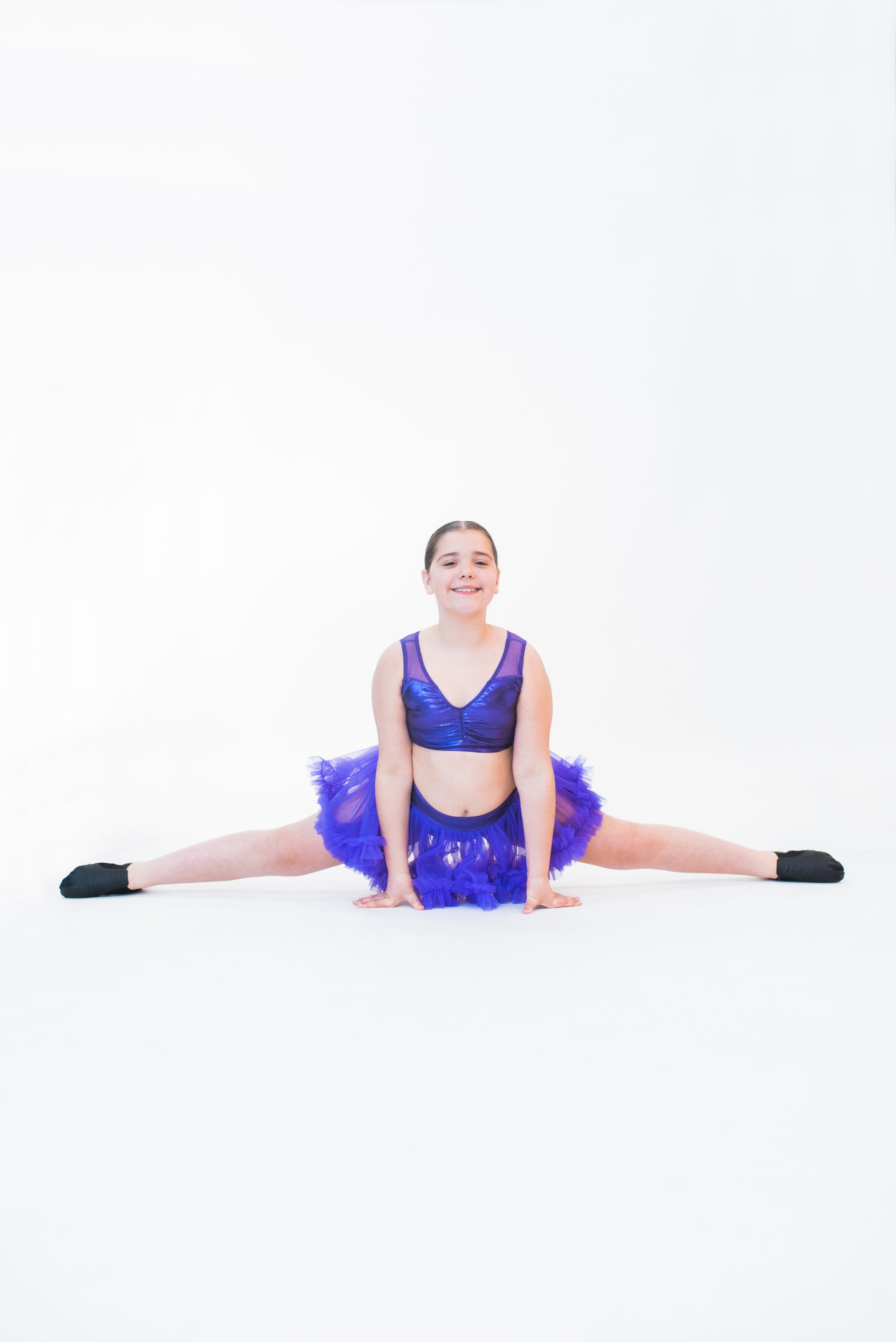 Iridescent purple foil front pinch detail top and shorts style for coverage with shoulder cutouts in purple glitter mesh and attached skirt in purple glitter fluff tulle.