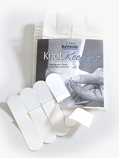 Directions: with ribbons tied and tucked in, slip in knot keeper with removable strips facing out. Unpeel strips one at a time and fold ends over ribbon. Press firmly to adhere. To remove, simply tear off.