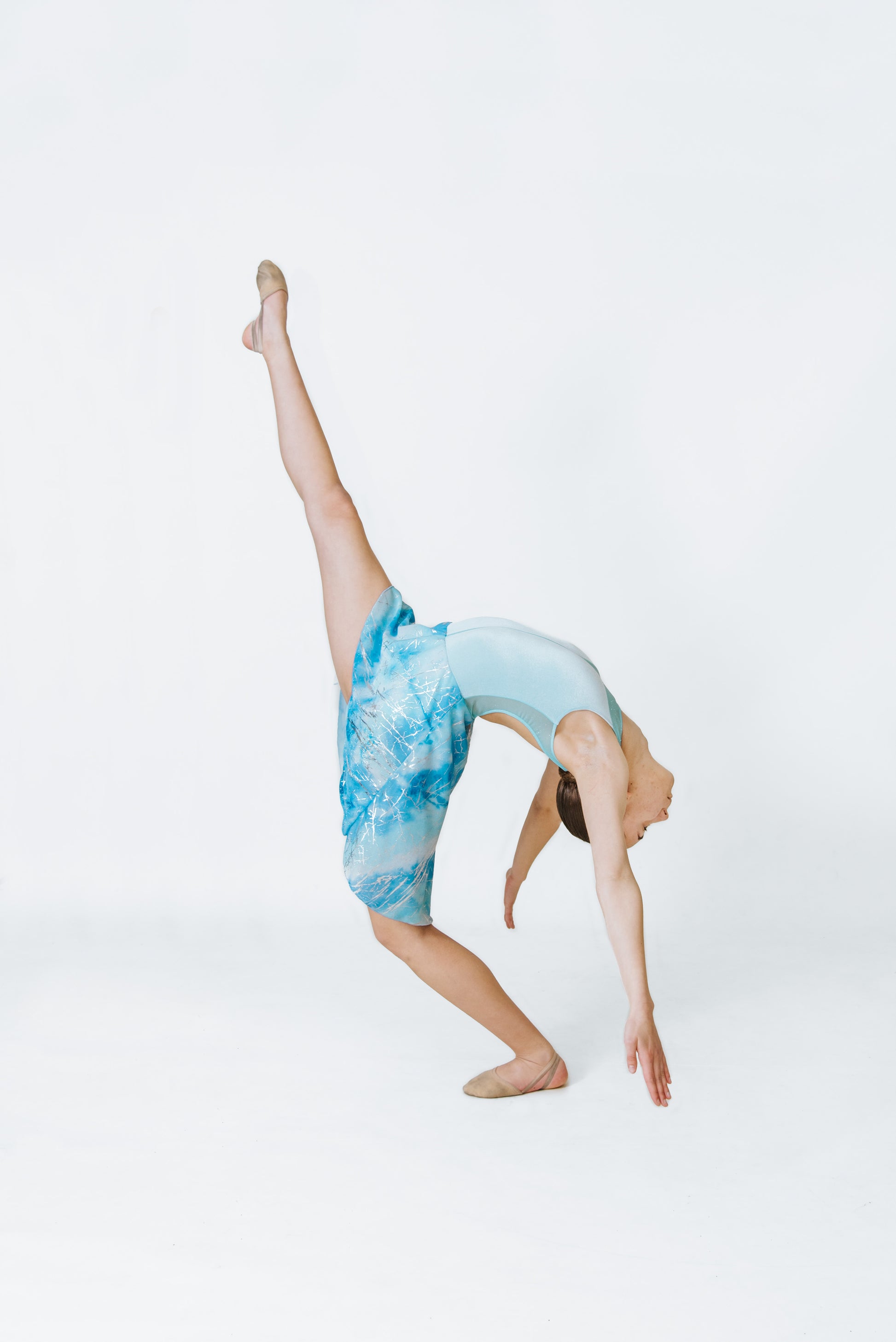 Sky blue deluxe velvet, faux deep front cut in sky glitter with attached ice sculpted lyrical skirt.