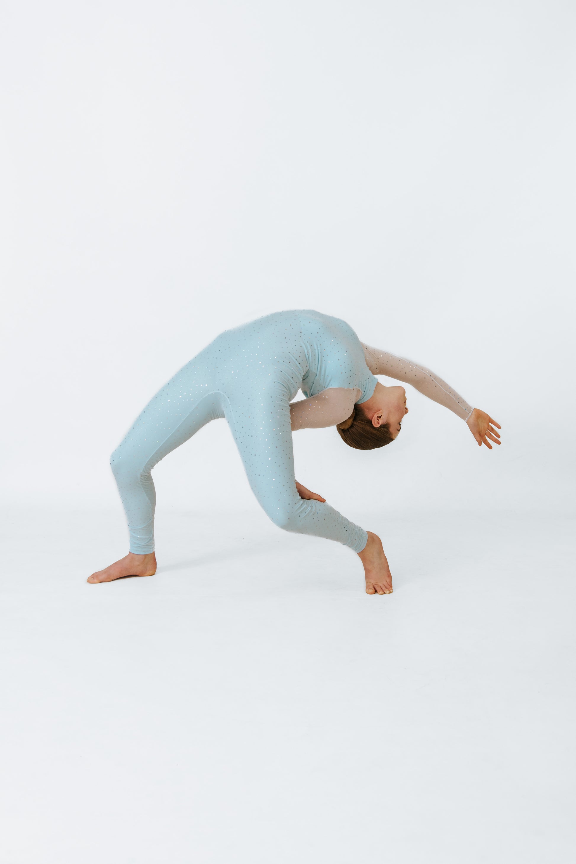 Make your presence known in the ultimate contemporary piece. Designed with white sheer sequin mesh over sky blue spandex and open keyhole back detail for the ultimate on stage goosebumps..