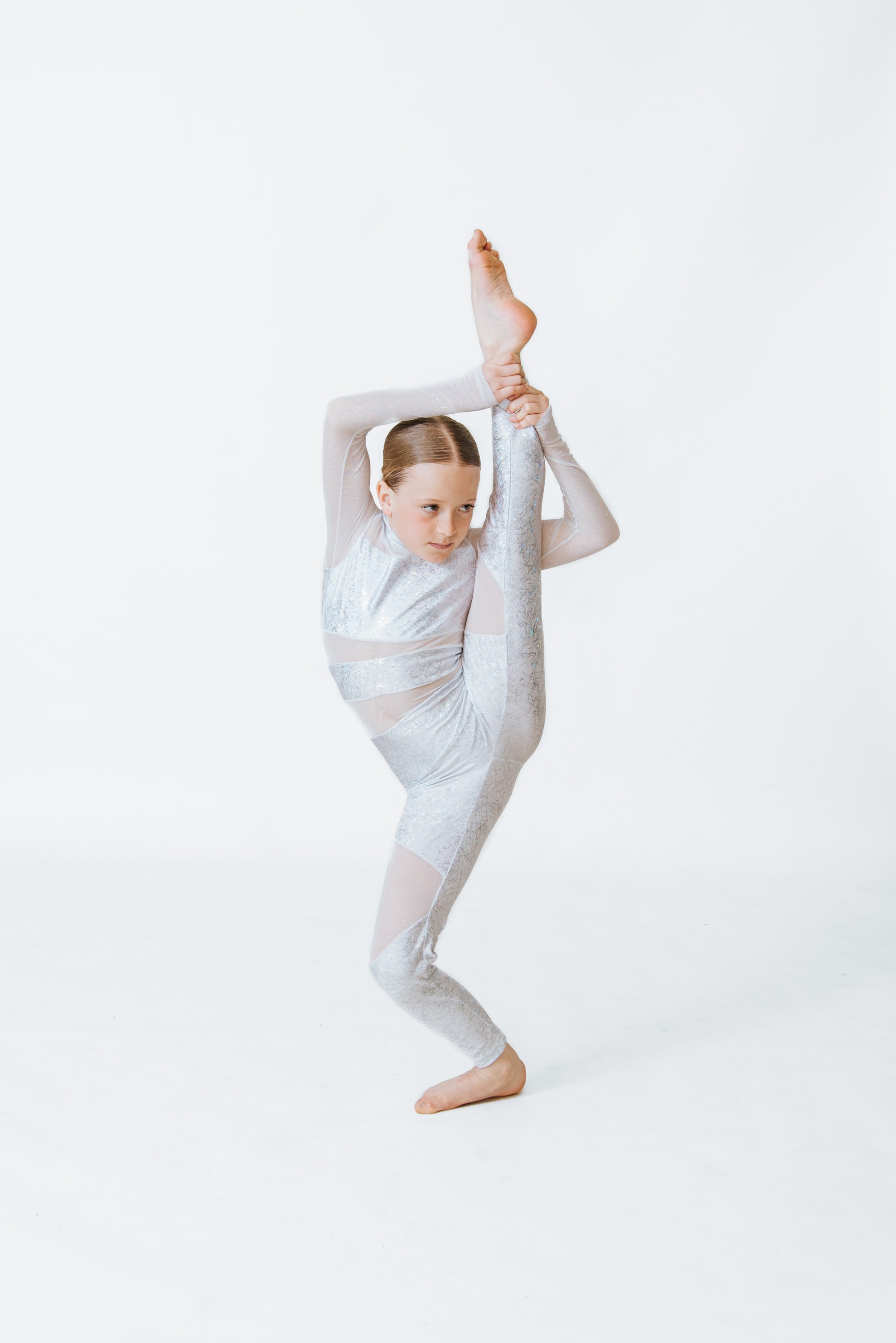 White glitter swirl with 2 tummy cutouts & asymmetrical thigh cutouts in white glitter mesh..