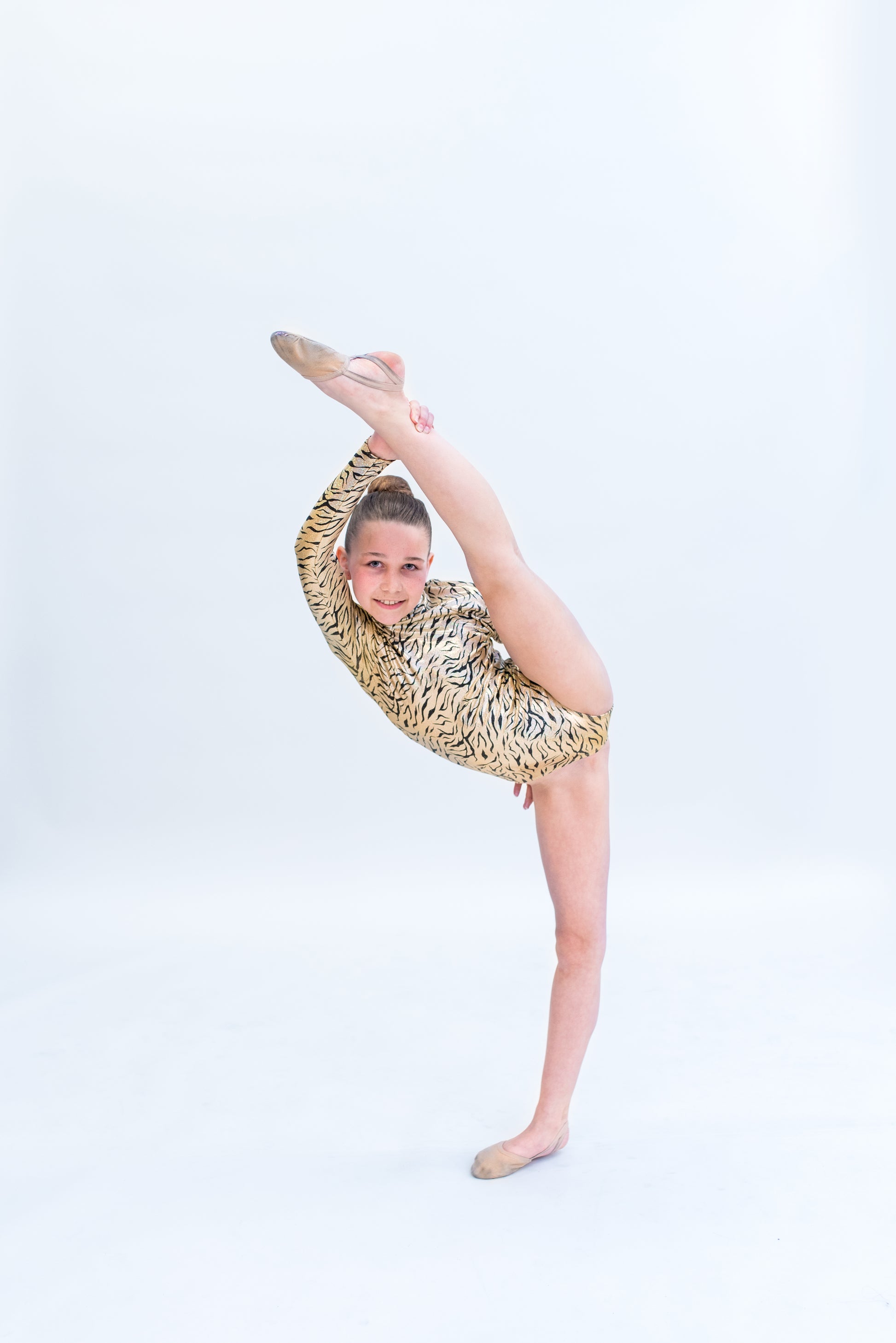 Flashy glitter gold tiger stripe bodysuit with high neck clasp and slanted fabric shoulder cuts for an exaggerated shoulder.