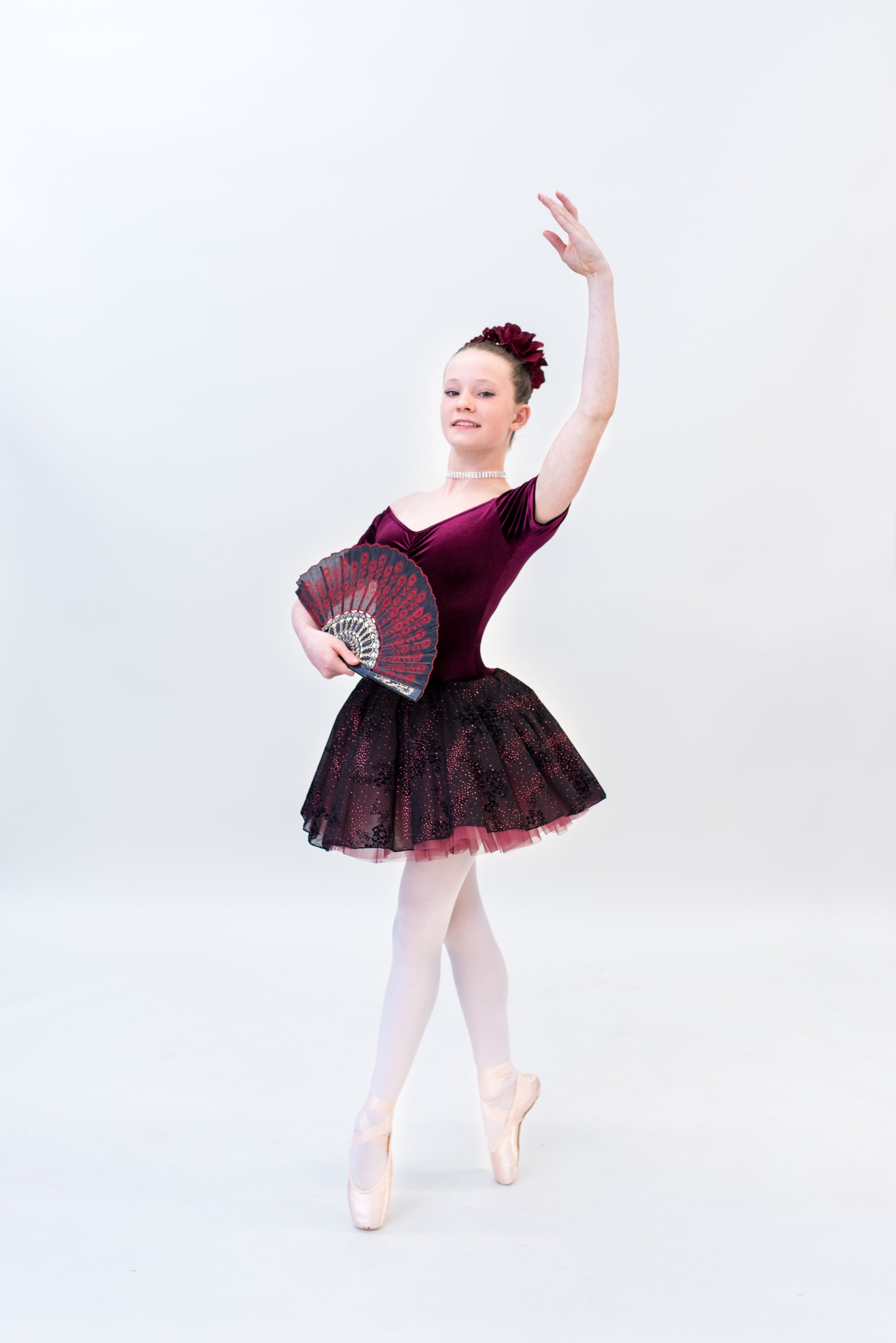 Model wearing 'Spanish Coffee' & Red Rose Hair Piece.