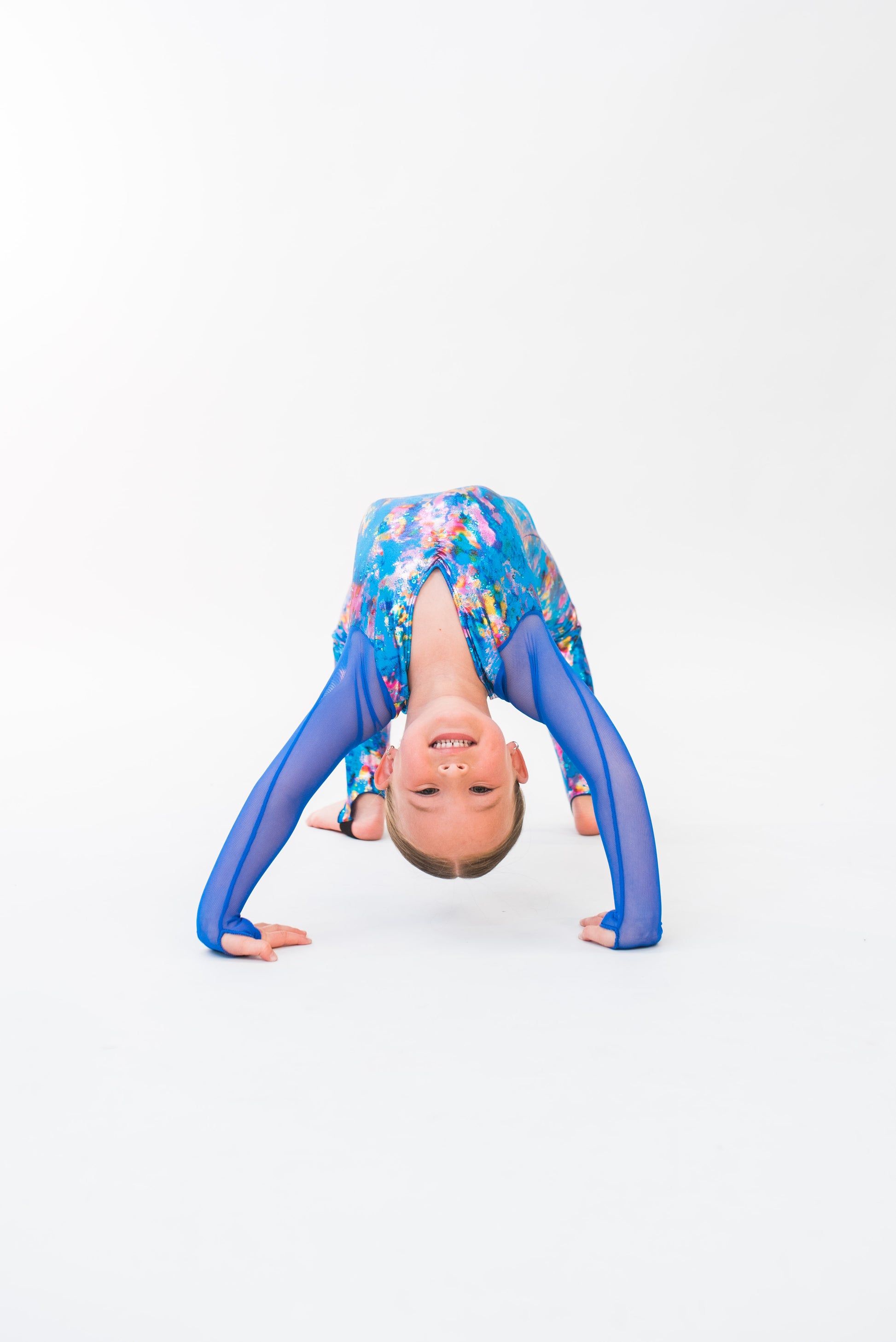 Blue galaxy foil print with arm cutouts in royal blue and open keyhole back detail..