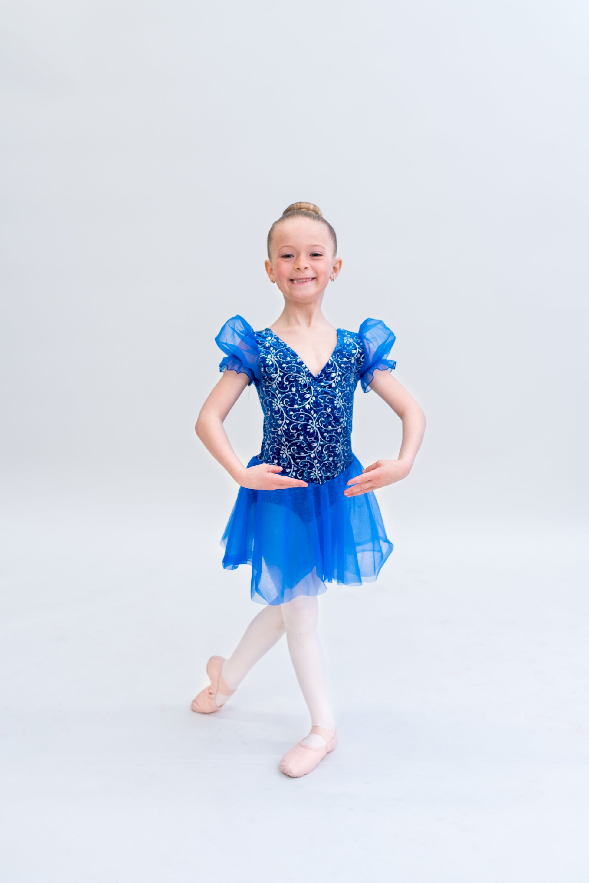 Glitter embroidered deluxe velvet in royal blue with attached skirt and cinch puff sleeves in royal blue feather. Designed with front pinch bodice for aesthetic.